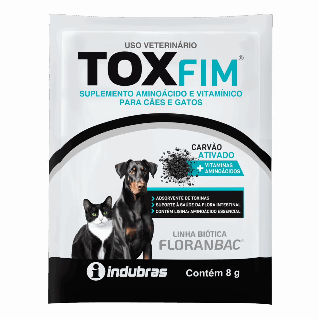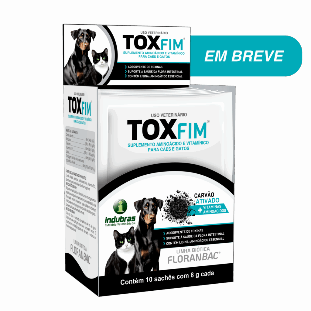 A linha Floranbac da Indubras apresenta o TOXfim, um suplemento aminoácido e vitamínico para cães e gatos, com carvão ativado e probióticos em sua formulação. É um produto desenvolvido para oferecer auxilio no balanço nutricional e recomposição da microbiota intestinal.