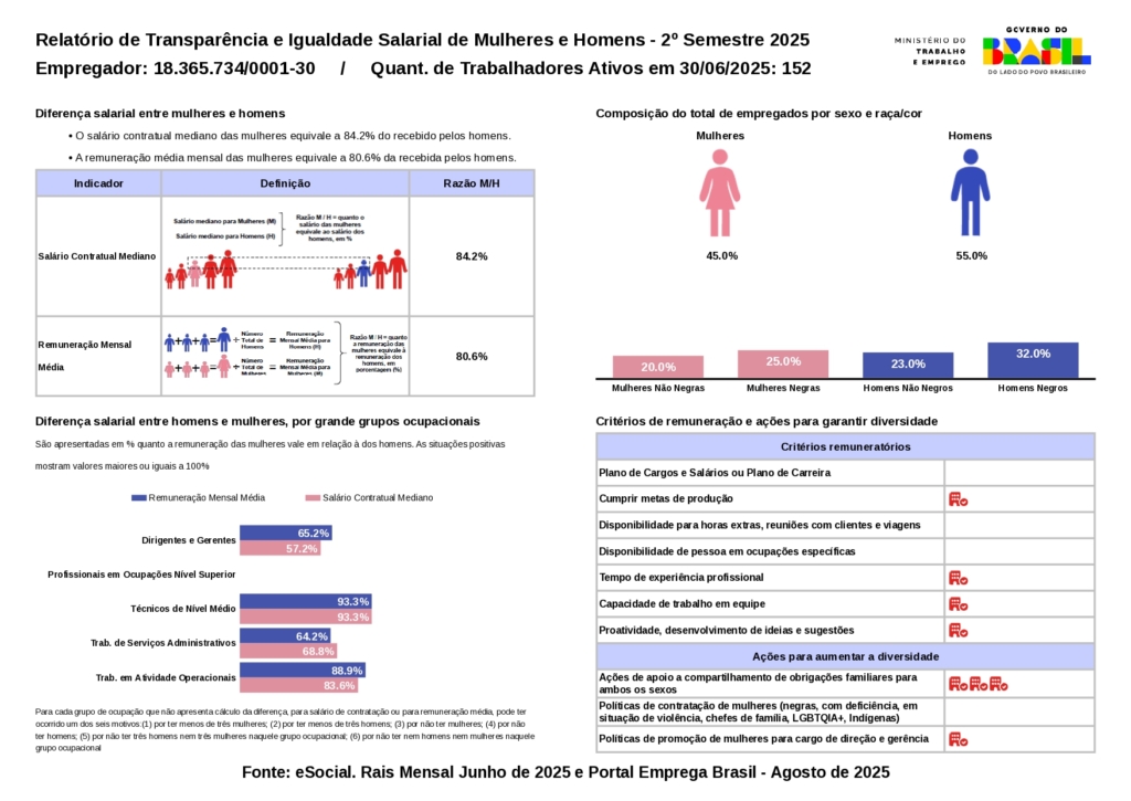 Este documento, referente ao segundo semestre de 2025, reforça nosso compromisso com a promoção da igualdade de oportunidades no ambiente de trabalho, além de evidenciar o progresso contínuo em direção a uma cultura organizacional mais justa e inclusiva, onde tanto mulheres quanto homens sejam valorizados igualmente por suas contribuições.